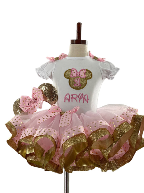 Guaranteed to stand out in this Pink and Gold Polka Dot Birthday Ribbon Trimmed Tutu Outfit