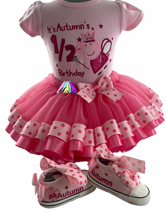Guaranteed to stand out in this Pink and Gold Polka Dot Birthday Ribbon Trimmed Tutu Outfit