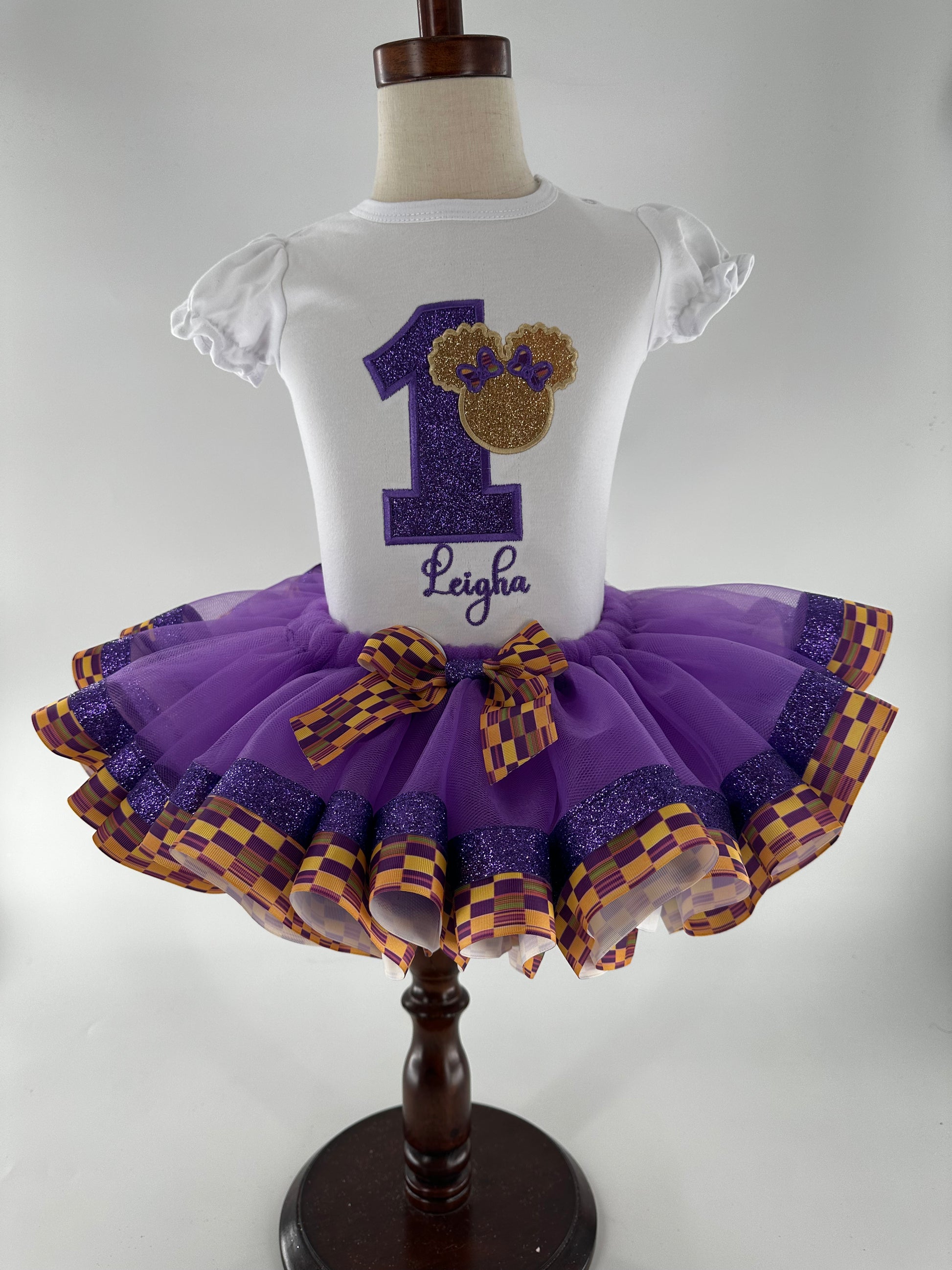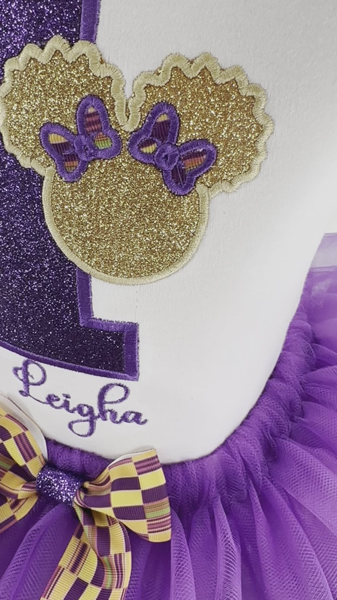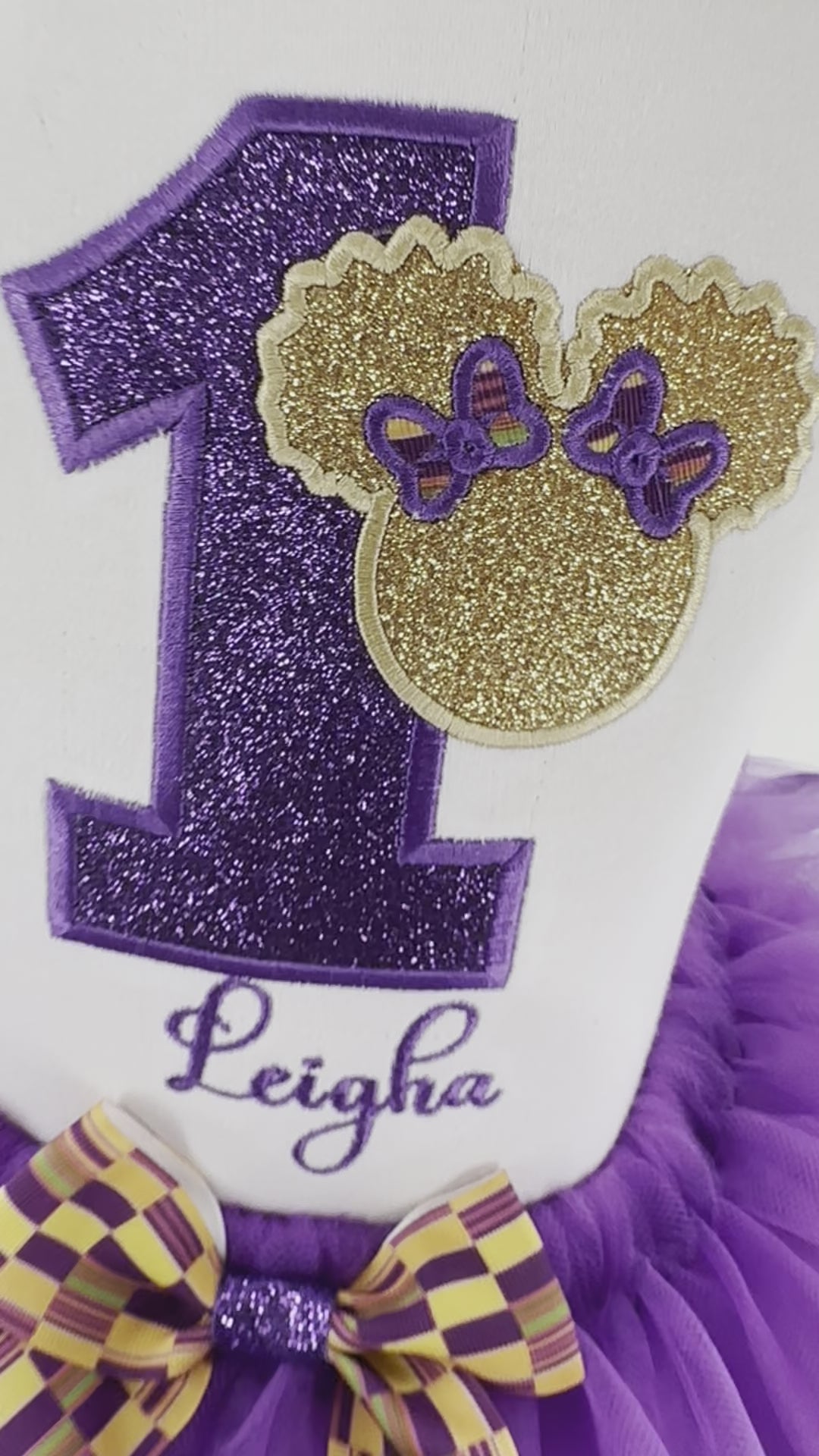 Introducing our Afro Puff/African Purple Print Tutu Set! This adorable online_store exclusive features a vibrant purple and yellow tutu paired with a cute design on the shirt. Perfect for little fashionistas celebrating their birthday milestone.