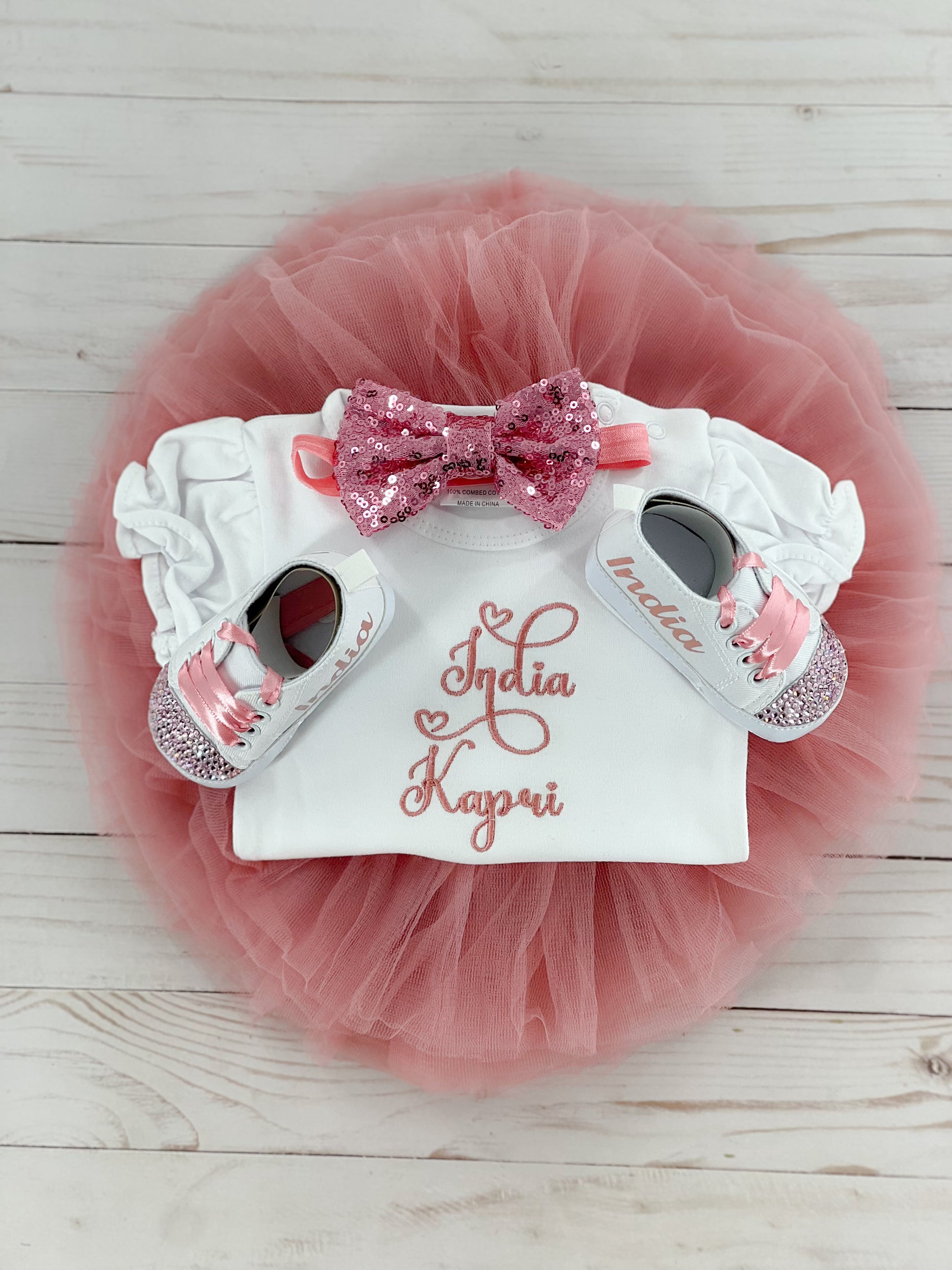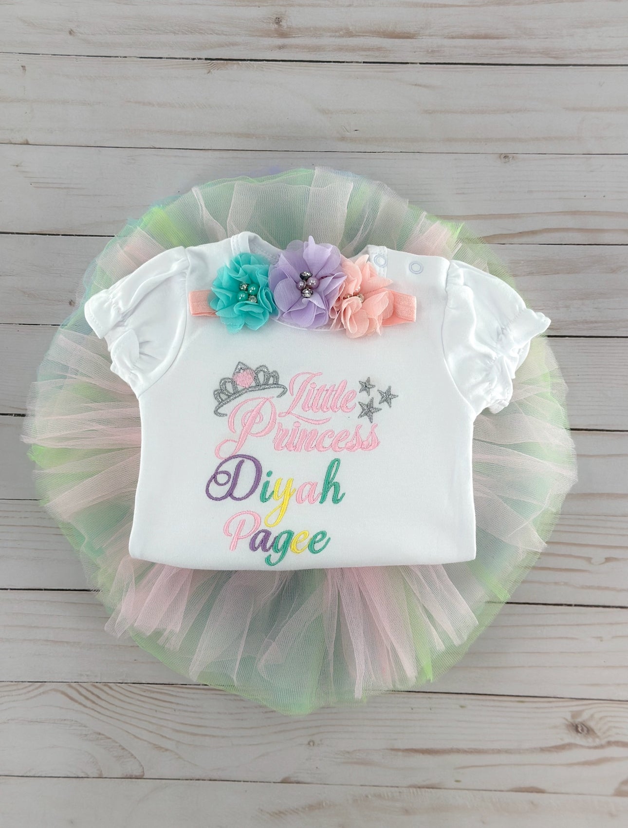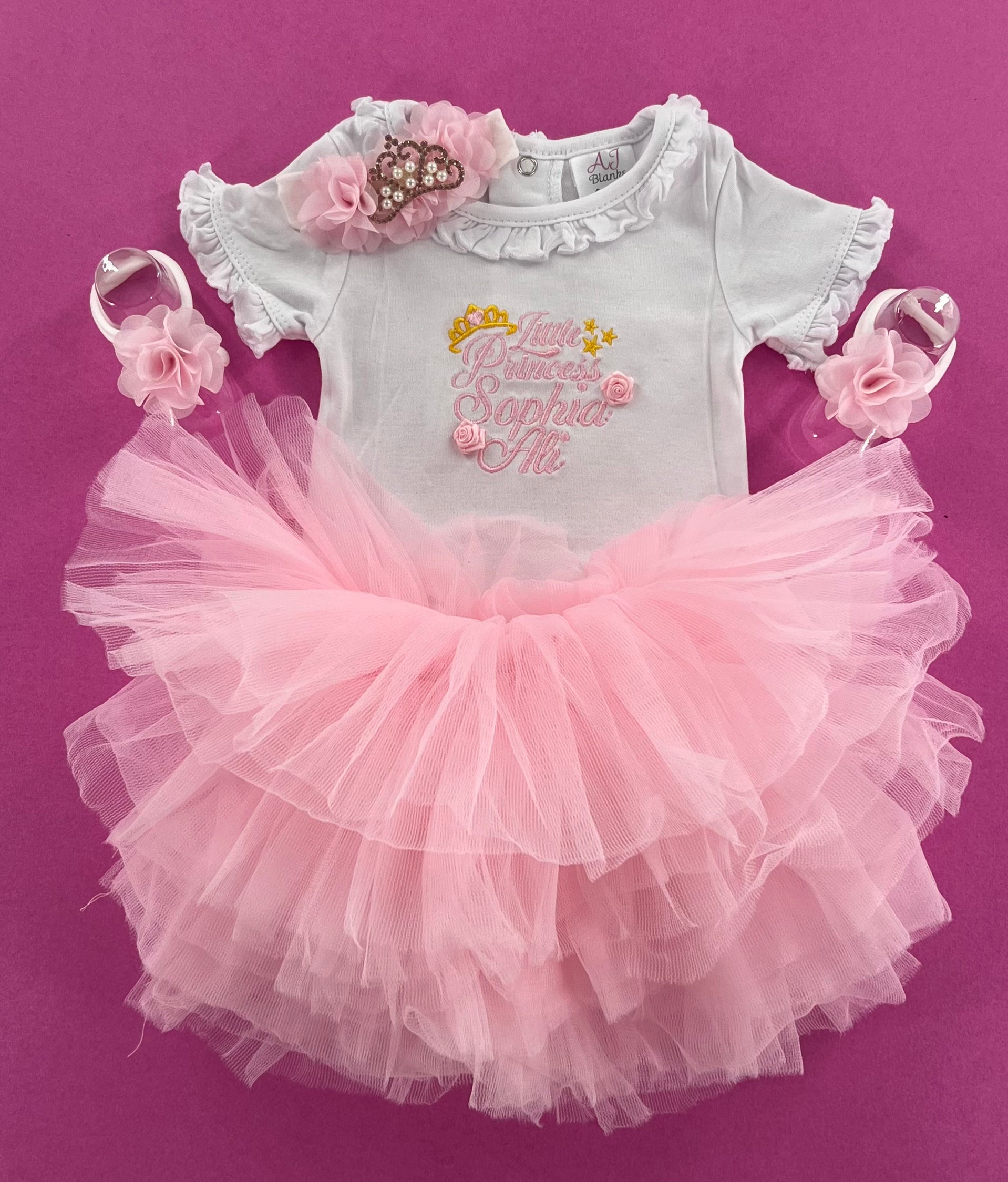 Introducing our Baby Tutu Outfit, fit for a little princess! This adorable ensemble features a tutu, personalized bodysuit adorned with the name and matching headband.