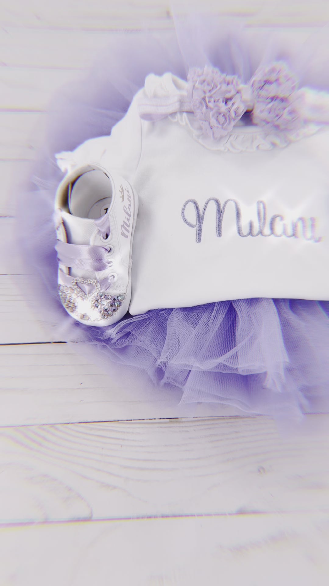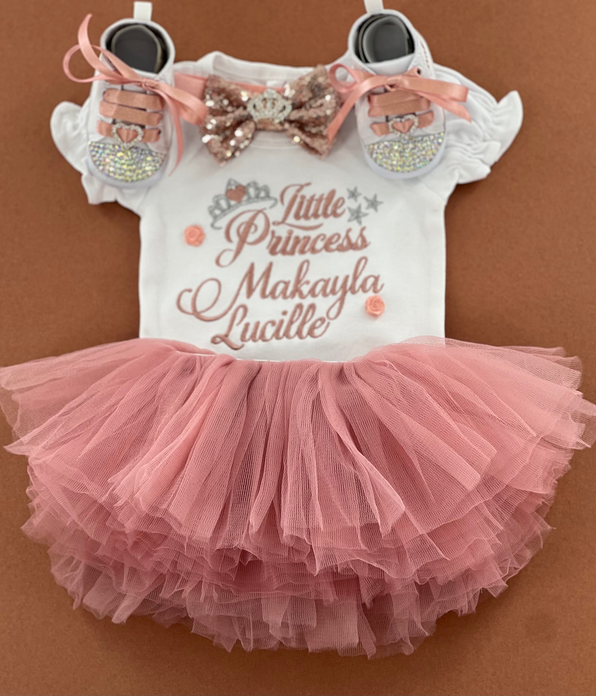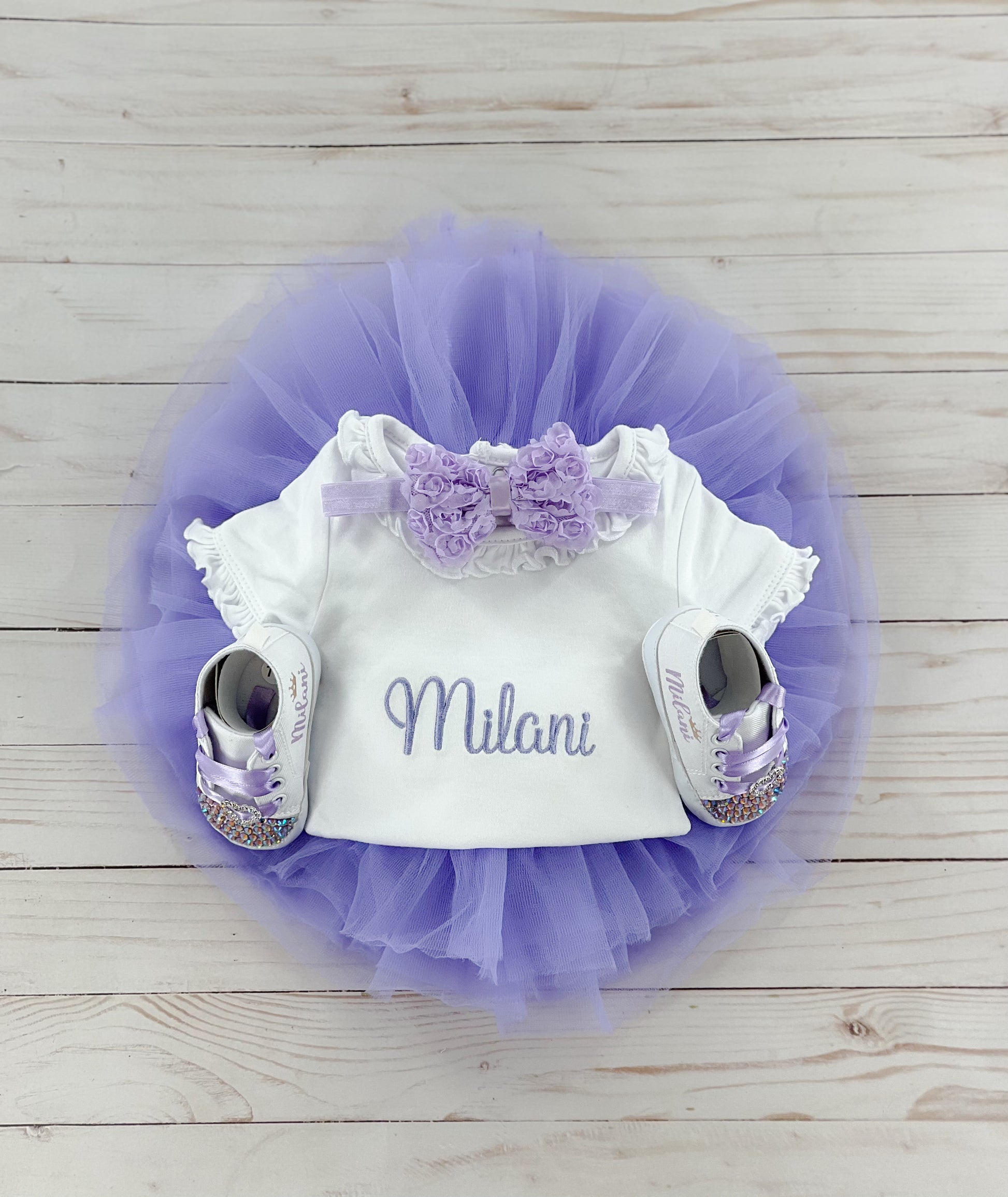 Introducing our Baby Tutu Outfit, fit for a little princess! This adorable ensemble features a tutu, personalized bodysuit adorned with the name and matching headband.