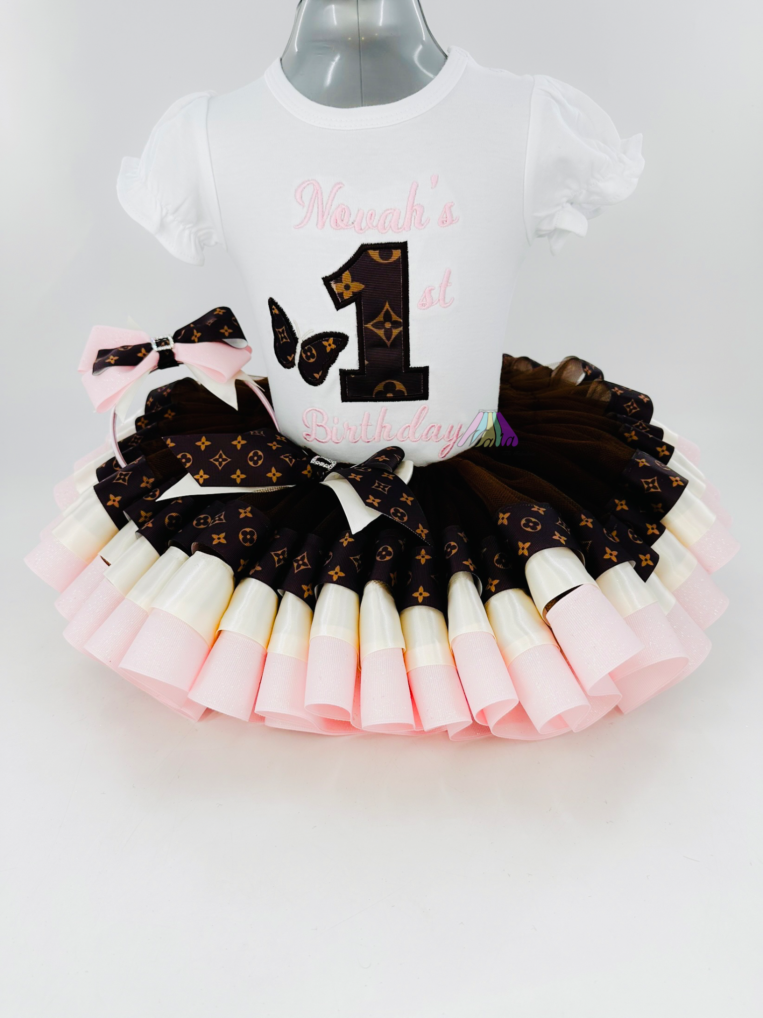 Brown, Pink and Bone Baby 1st BirthdayTutu Set! Featuring a delightful emblem pattern brown ribbon. Paired with a lovely white shirt elegantly embroidered with a number one and a serenity butterfly. Perfect for your little princess. Exclusively available at our online store.